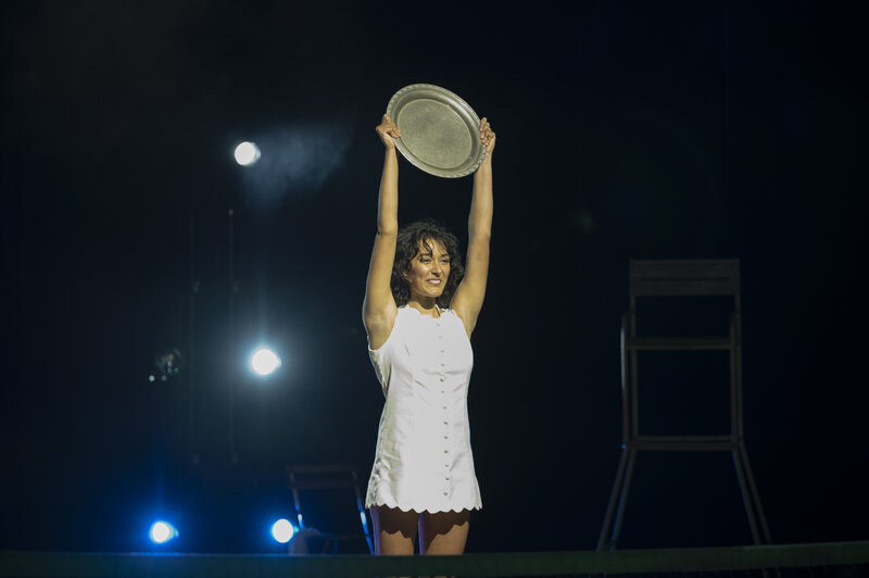 The thing that immediately strikes you as you enter Southbank Theatre, The Sumner is that the traditional theatrical setting has been upended. In short, there is tiered seating on either side of a tennis court. The net can be wheeled around, as it is at various junctures, while projections appear on the surface of the court. So, there you have it, a specially constructed and highly appropriate “stage” for a play about a woman who rose to attain the world #1 tennis ranking. The set and costumes have been designed by Romanie Harper.