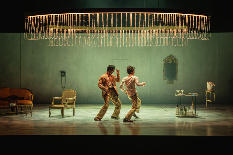 One of the other great attributes of Sydney Theatre Company’s The Talented Mr Ripley is its staging. As representations of place, furniture and props are critical. Elizabeth Gadsby is the set designer. From suitcases and a clothes rack in a wardrobe, from a drinks trolley to a small boat, from a sofa to a painting on a wall, all are moved in and out seamlessly. Amongst the rising tension, the use of a small, cheap fan brings howls of laughter (as is the intent).