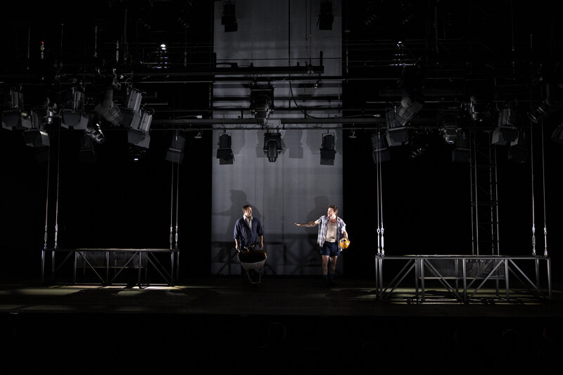 The banter of workers, the sparks from welders, the sound of steel and concrete moving, before collapsing are captured by composer and sound designer Kelly Ryall. The lighting (and deliberate lack thereof upon the bridge collapse) is the haunting domain of Niklas Pajanti. The costuming by Christina Smith readily distinguishes the workers from the managers. Beams hydraulically lifted and lowered throughout the production and twisted girders after the collapse are particularly impactful, again the conceit of Christina Smith.